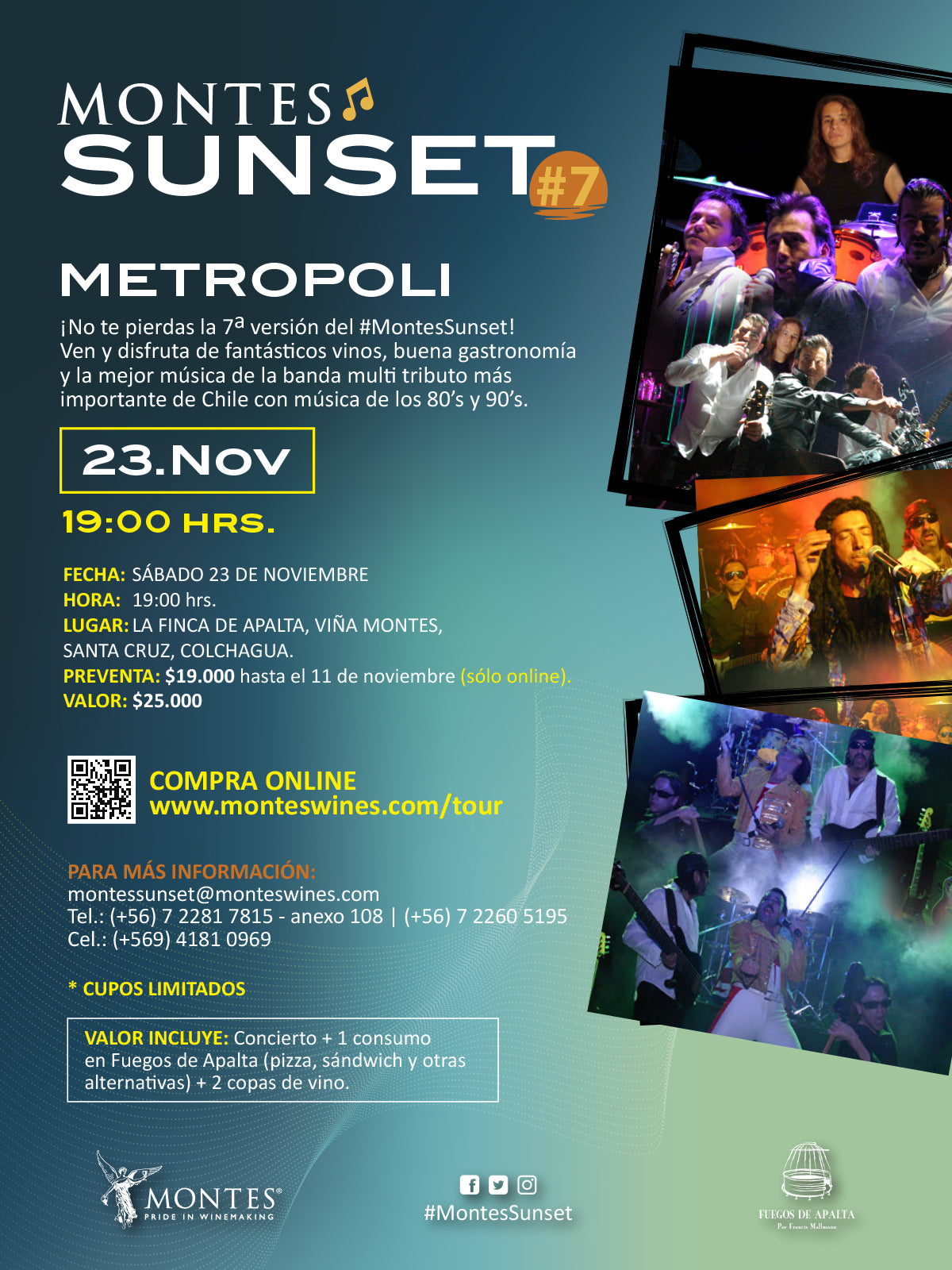 “Metrópoli” una de las bandas multi tributo de todos los tiempos, será la encargada de dar la bienvenida a la temporada estival con el séptimo sunset que Viña Montes realiza en su bodega de Apalta, en compañía del mejor vino y la música de los íconos de los ´80 y 90